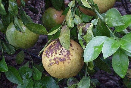 Citrus black spot symptoms are frequently numerous and irregularly distributed on the fruit peel. Leaf spots are olive green at first, later turning dark brown to black. The particular disease symptoms in fruit trees include holes in the leaves, as well as new shoots, and even whole branches dying off. The disease is generally more severe in trees over ten years of age. Oomecyte phytophthora root and crown rot (phytophthora spp.) root and crown rot is caused by oomecytes, which are water molds.